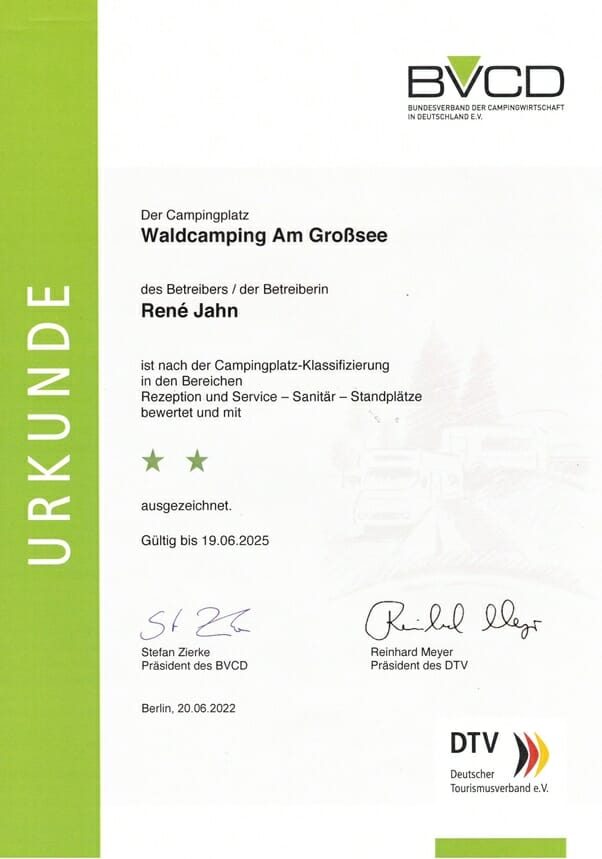 Es ist nun offiziell: Unser Campingplatz wurde im Juni 2022 vom Bundesverband der Campingwirtschaft in Deutschland e.V. (BVCD e.V.) klassifiziert und mit 2-Sternen ausgezeichnet.
